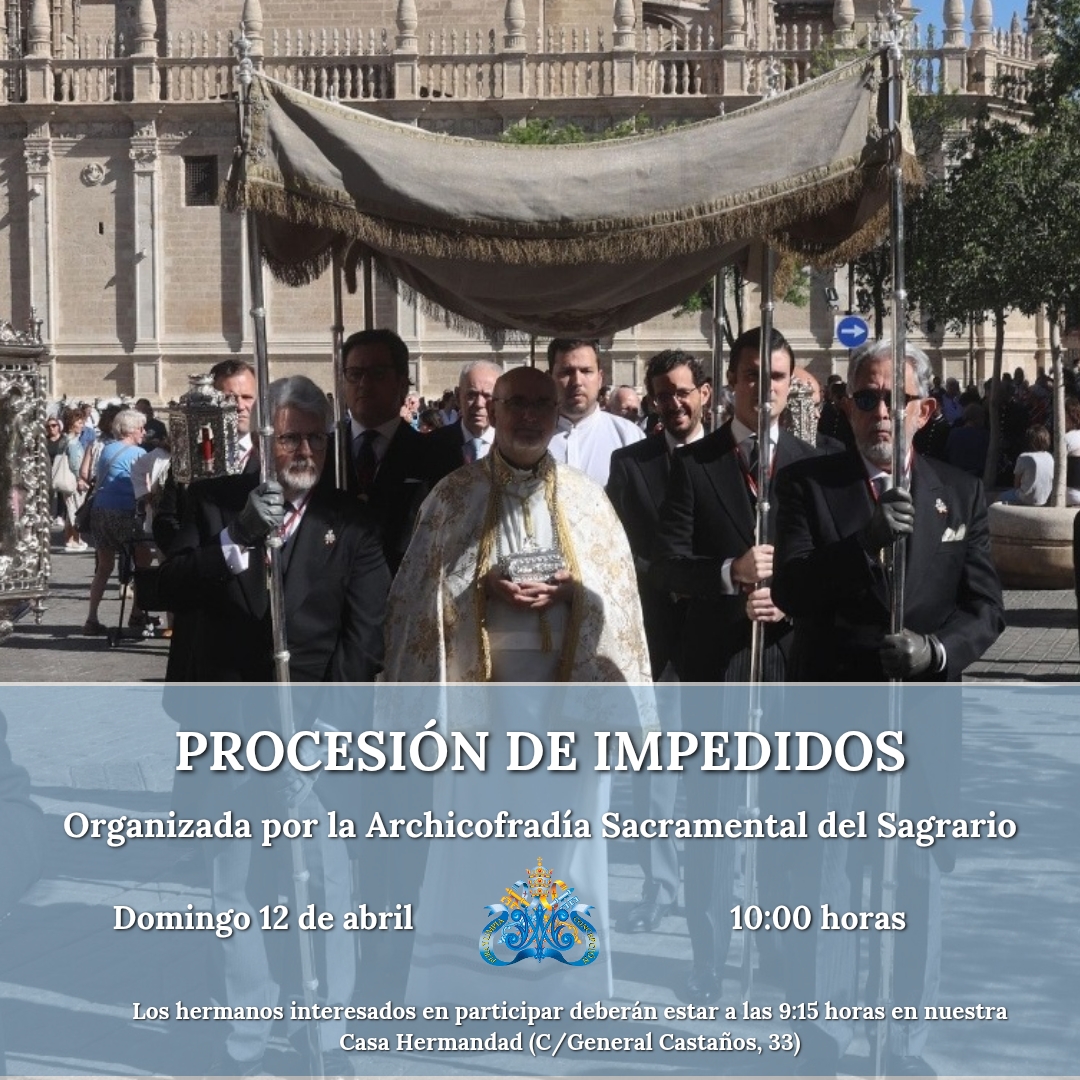 En particular, el próximo domingo 12 de abril a las 10:00 horas se celebrará la Procesión de enfermos e impedidos organizada por la Pontificia Archicofradía Sacramental del Santísimo Sacramento del Sagrario de la Santa Iglesia Catedral de Sevilla, en la que participaremos con nuestro estandarte y varas así como con cirios, junto con el resto de Hermandades y cofradías de la feligresía.